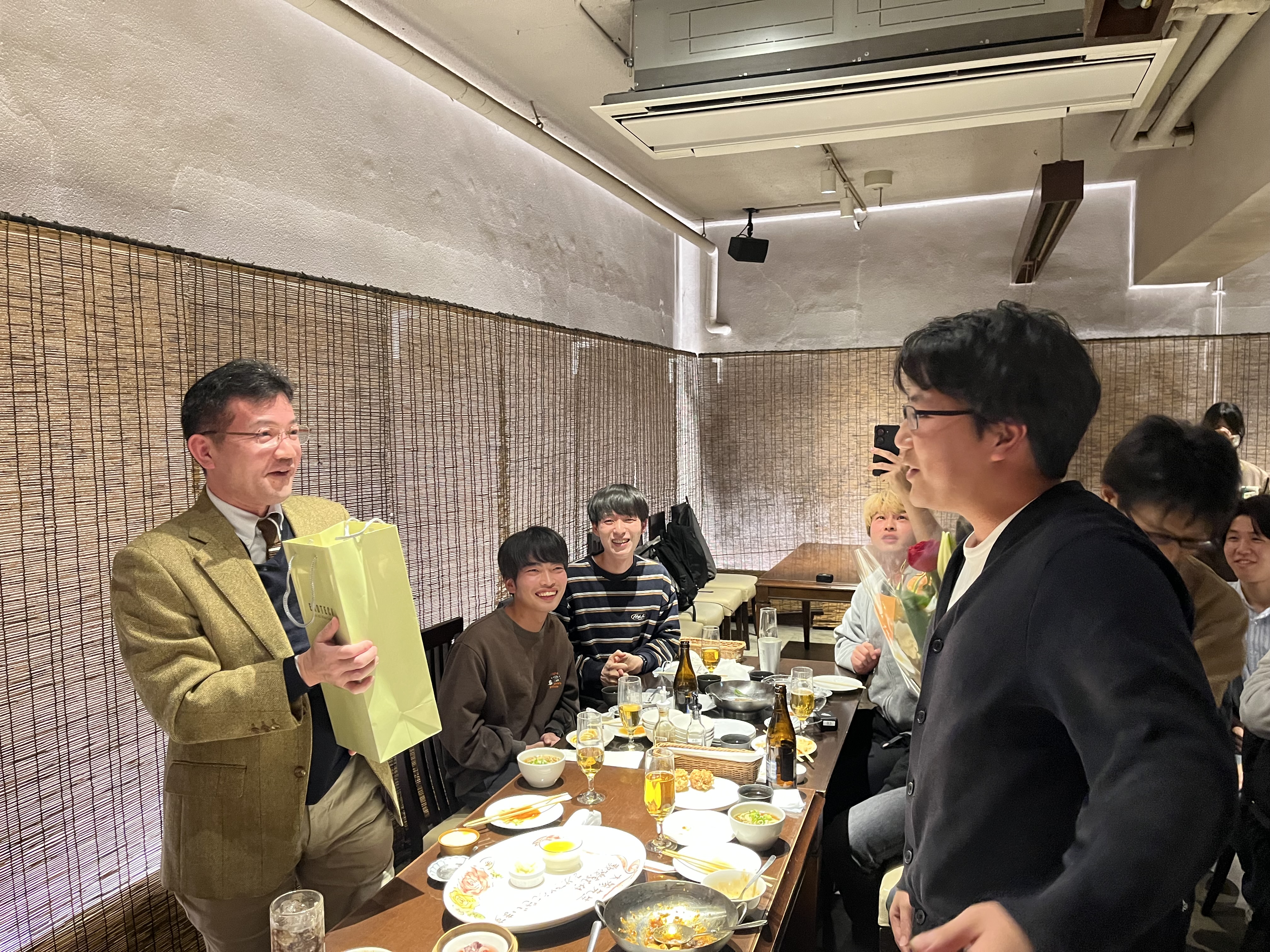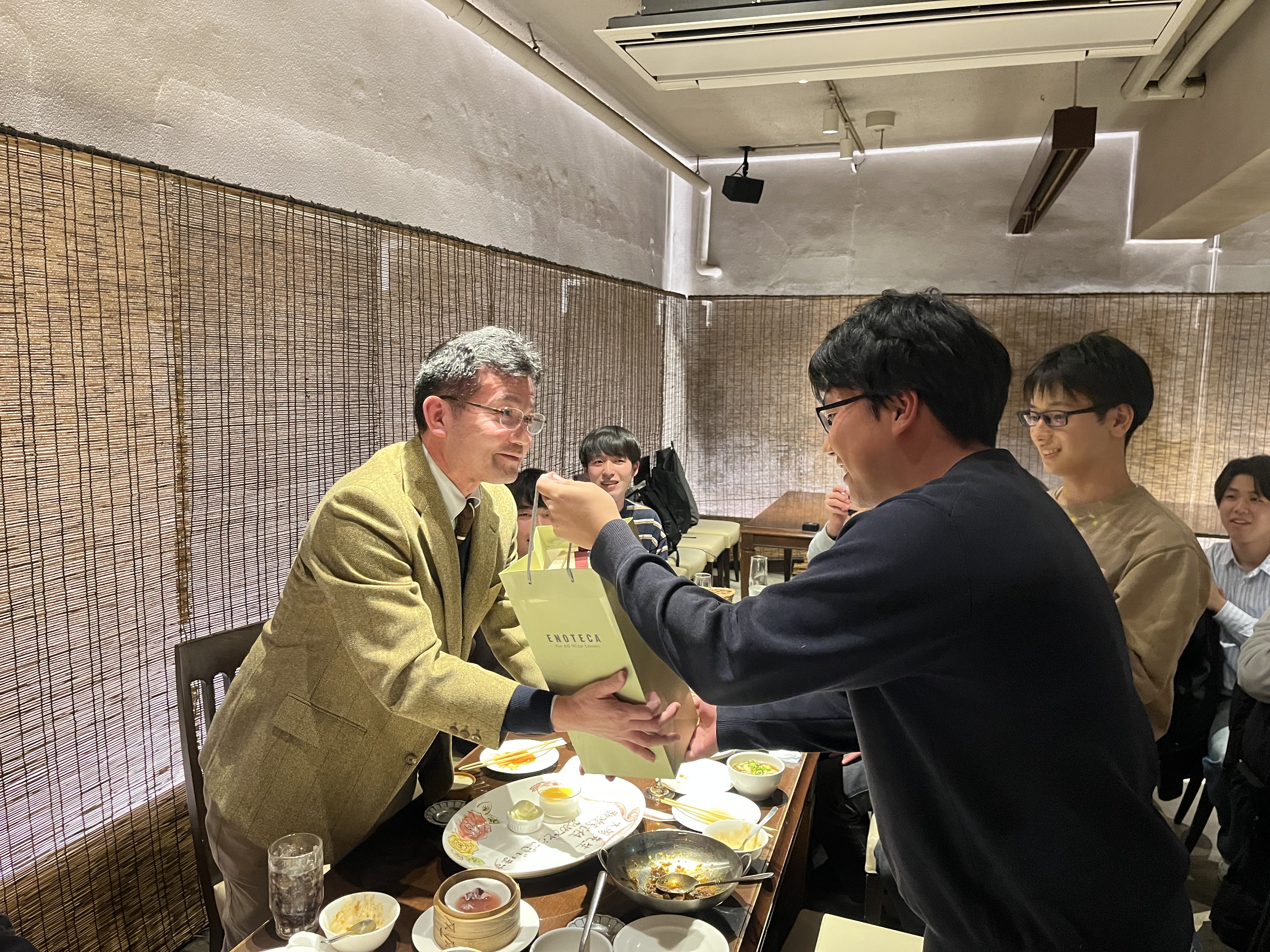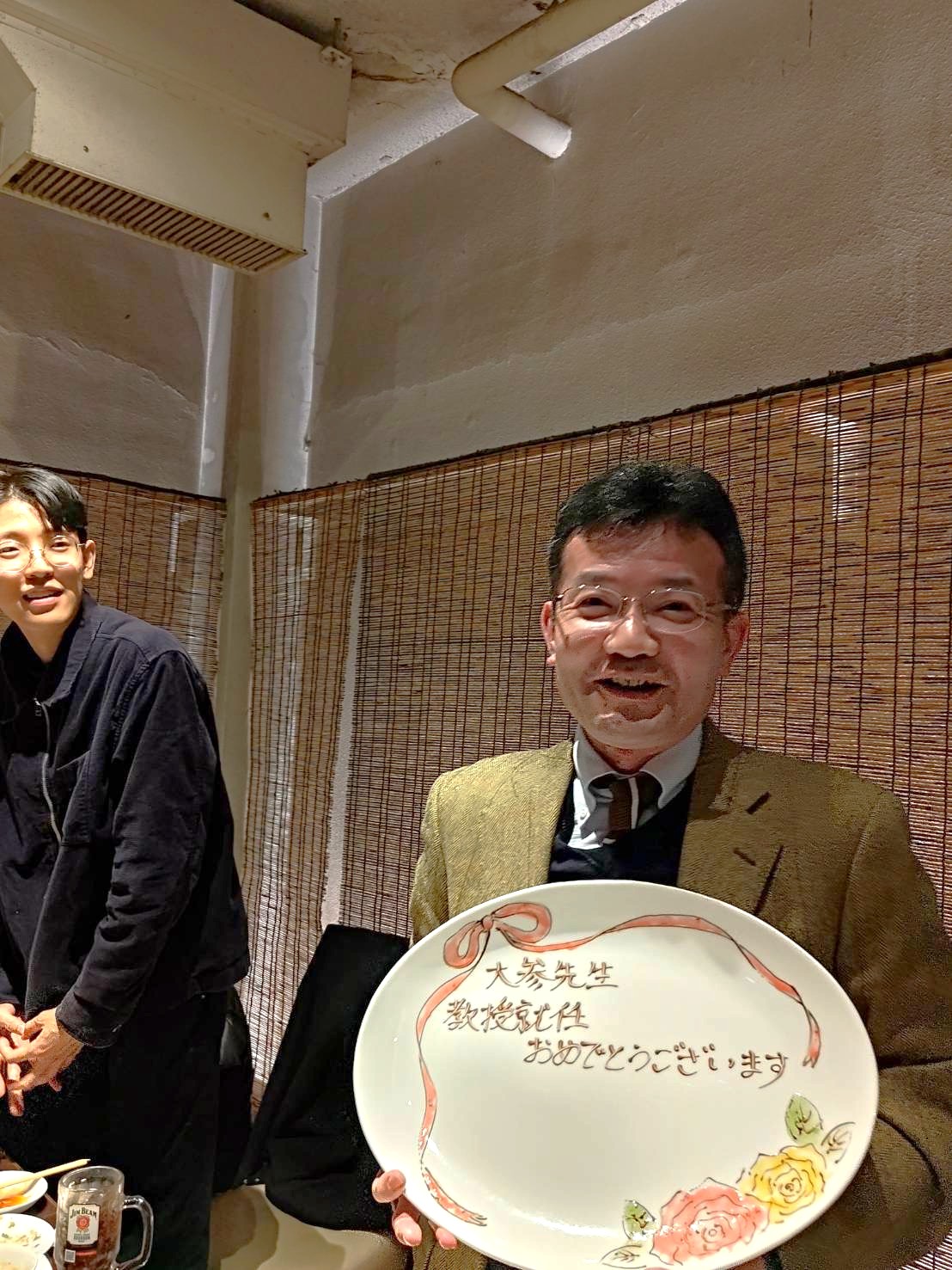 大参宏昌先生 の祝賀会を、研究室メンバーで開催しました‼ 10月1日付で教授にご就任された大参宏昌先生 の祝賀会を、研究室メンバーで開催しました。 和やかな雰囲気の中、会の終盤ではサプライズな贈り物、お祝いのメッセージプレートが運ばれてきました。 そして、先生にお祝いのお品物と花束をお渡ししました。 樋口君からは ワインの贈り物をお渡ししました。 学生さんたちが、数あるワインの中から厳選してくださったそうです! 安田君からは、花束をお渡ししました。 お祝いのメッセージプレート お祝いの花束 大参先生、改めて教授ご就任おめでとうございます! 学生さん達の素敵な企画をもあり、とても良い祝賀会となりました。 研究室メンバー一同、これからも研究活動に励んでまいります。 皆様、引き続き 『機能材料領域/大参研究室』 をどうぞよろしくお願いいたします。