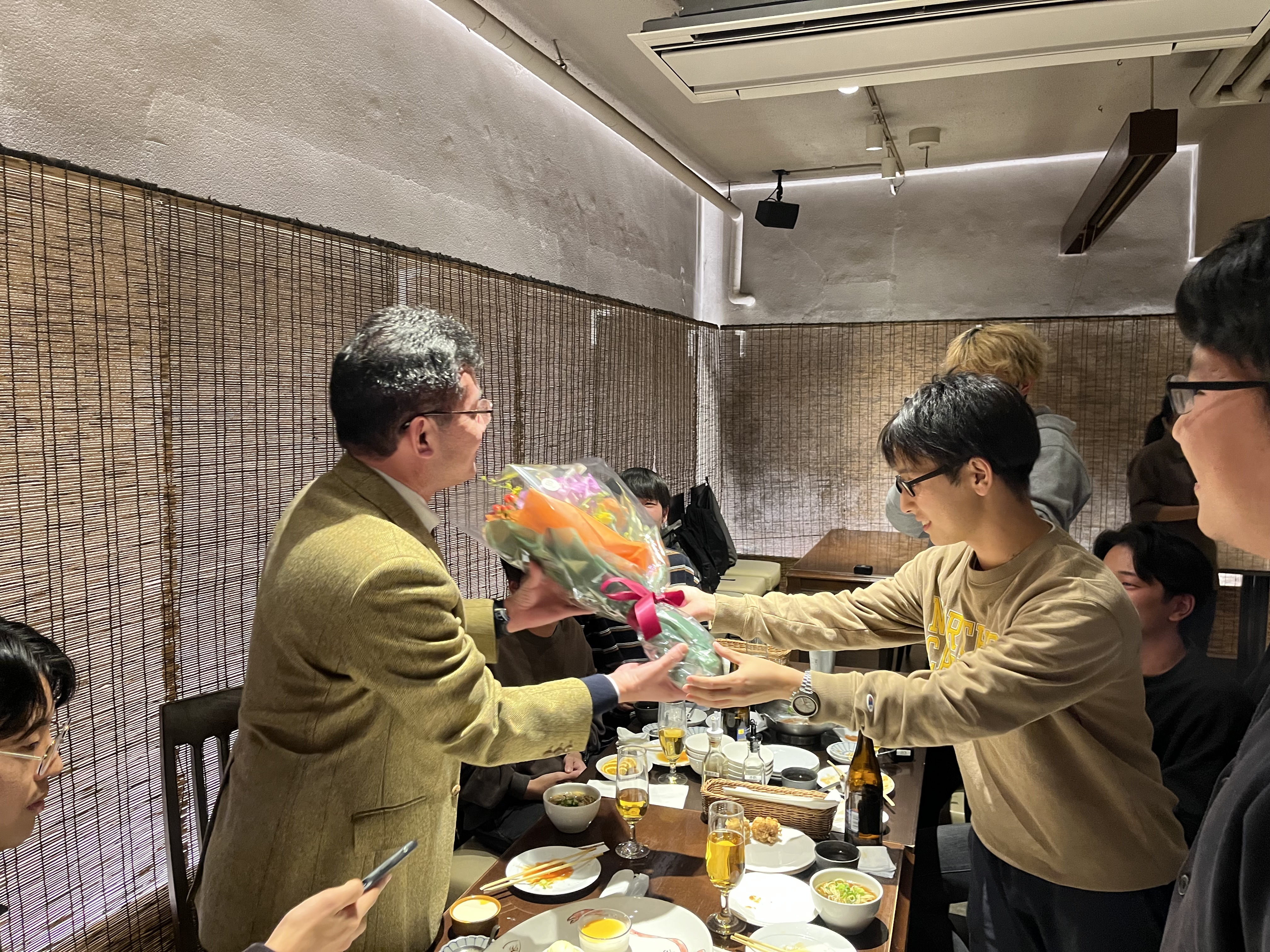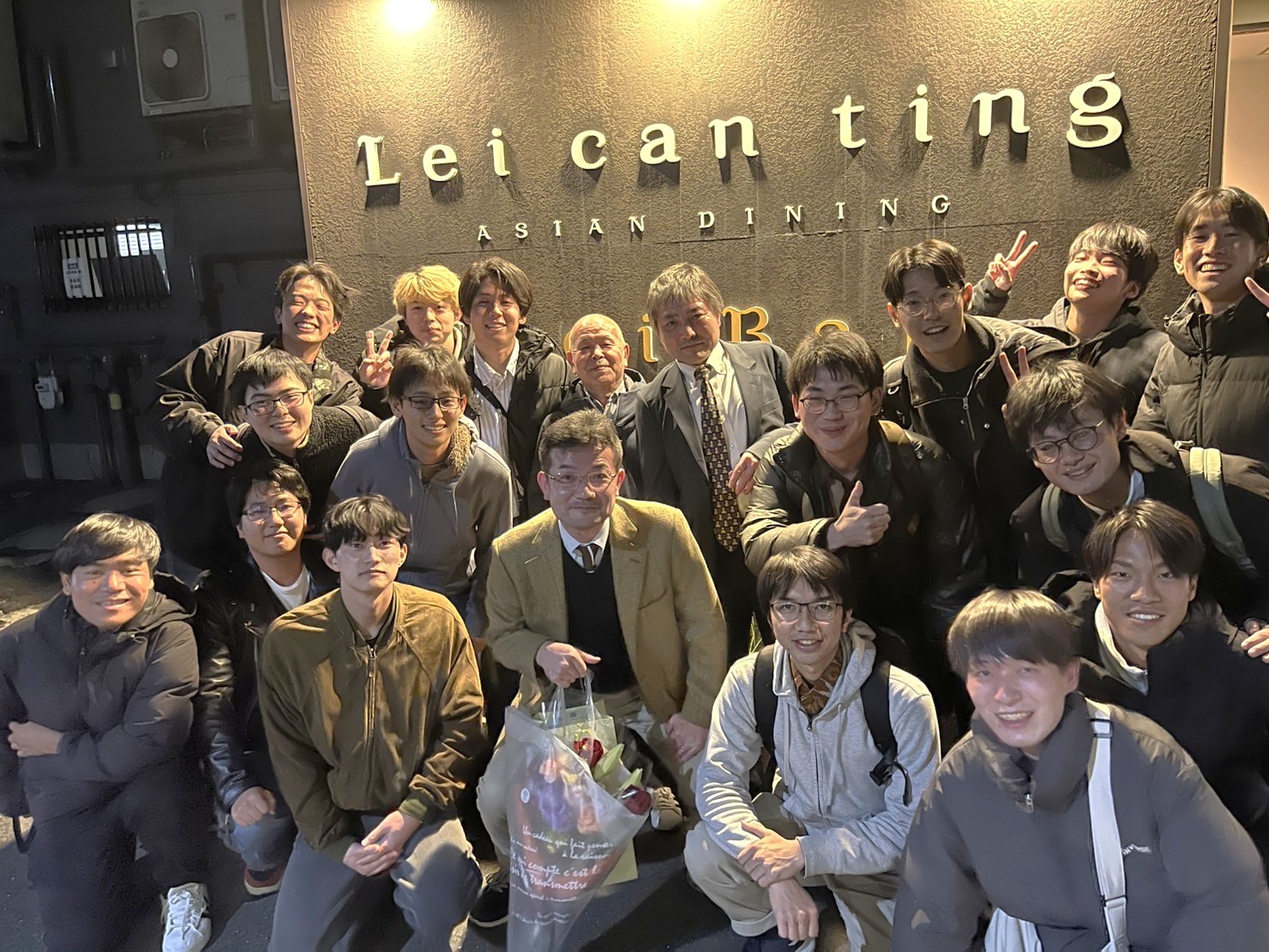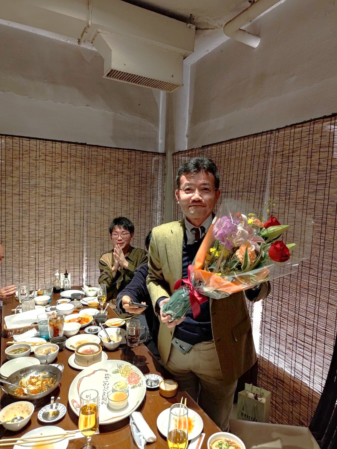 大参宏昌先生 の祝賀会を、研究室メンバーで開催しました‼ 10月1日付で教授にご就任された大参宏昌先生 の祝賀会を、研究室メンバーで開催しました。 和やかな雰囲気の中、会の終盤ではサプライズな贈り物、お祝いのメッセージプレートが運ばれてきました。 そして、先生にお祝いのお品物と花束をお渡ししました。 樋口君からは ワインの贈り物をお渡ししました。 学生さんたちが、数あるワインの中から厳選してくださったそうです! 安田君からは、花束をお渡ししました。 お祝いのメッセージプレート お祝いの花束 大参先生、改めて教授ご就任おめでとうございます! 学生さん達の素敵な企画をもあり、とても良い祝賀会となりました。 研究室メンバー一同、これからも研究活動に励んでまいります。 皆様、引き続き 『機能材料領域/大参研究室』 をどうぞよろしくお願いいたします。